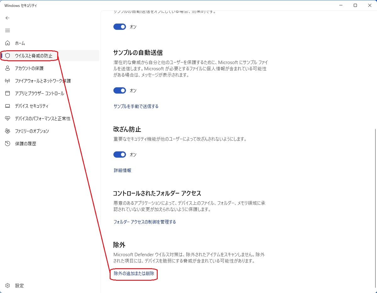 これで、そのフォルダはリアルタイム保護やスキャンの対象から除外されます。