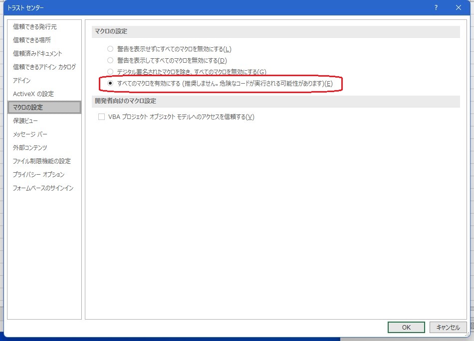 「開発」タブ →「マクロのセキュリティ」→「マクロの設定」→「◎すべてのマクロを有効にする」