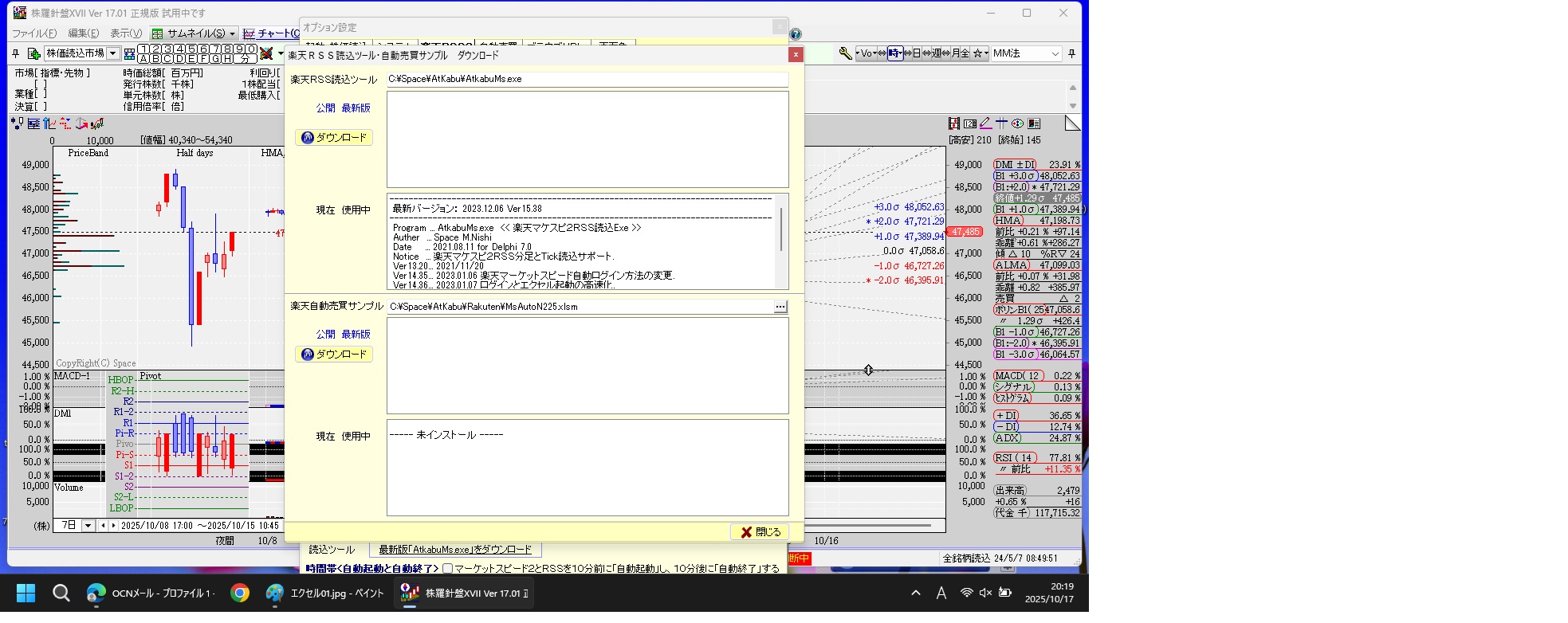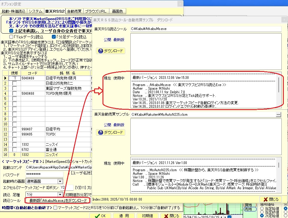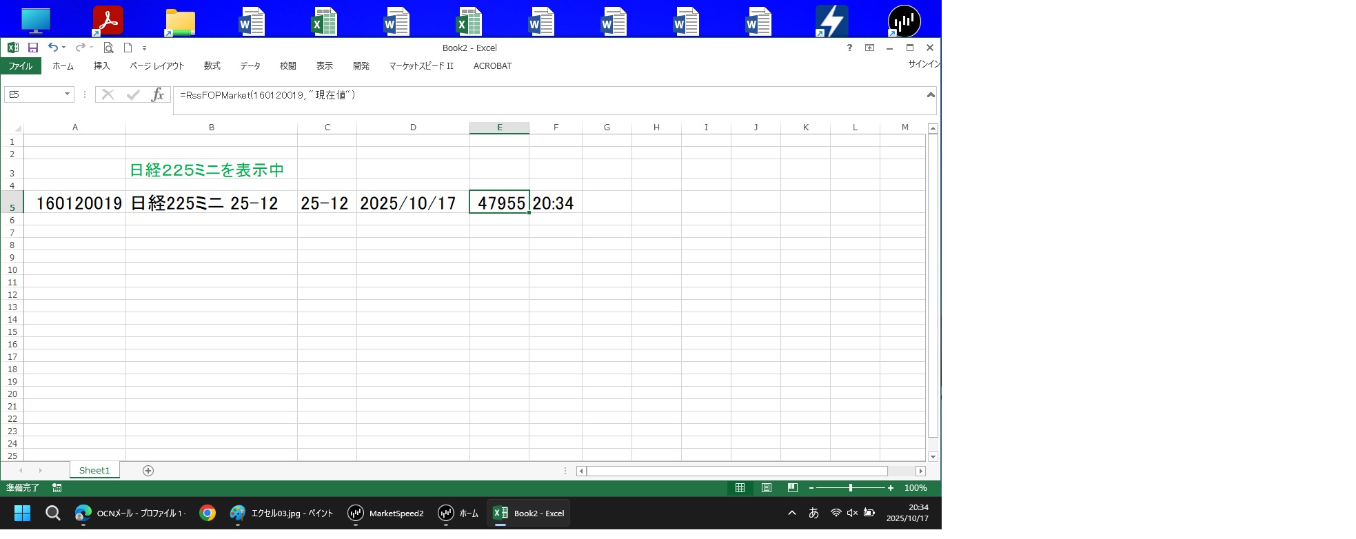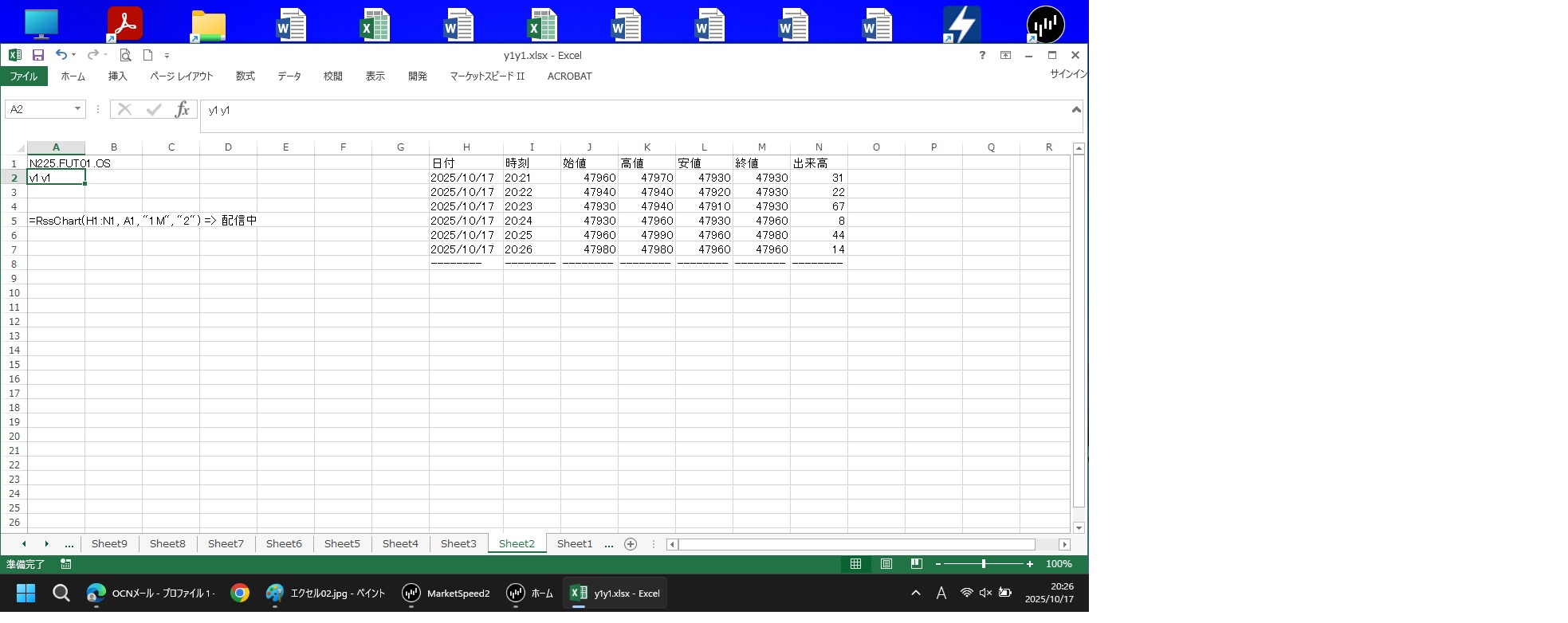 日経平均先物ミニ N225M.FUT01.OS 分足のデーターを毎分ごとExcelシートに書き込まれます。