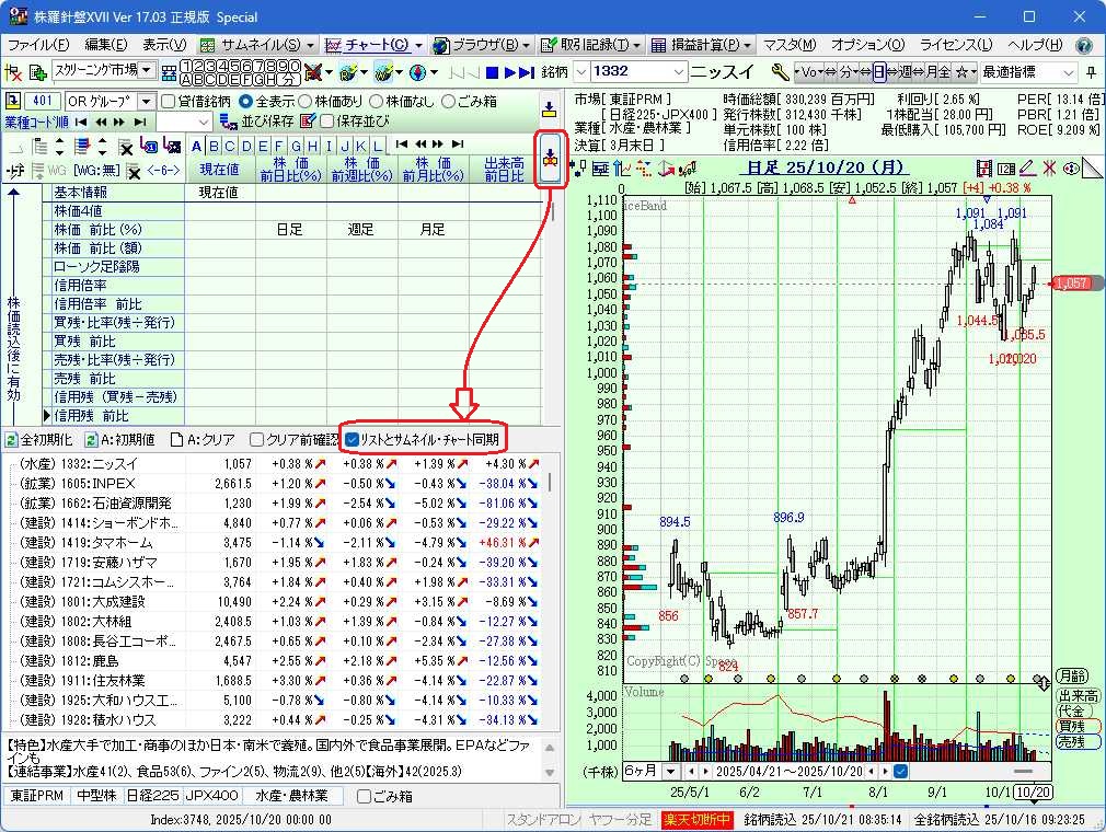 参考図の様に[リストとサムネイル・チャート同期]をチェックして下さい。