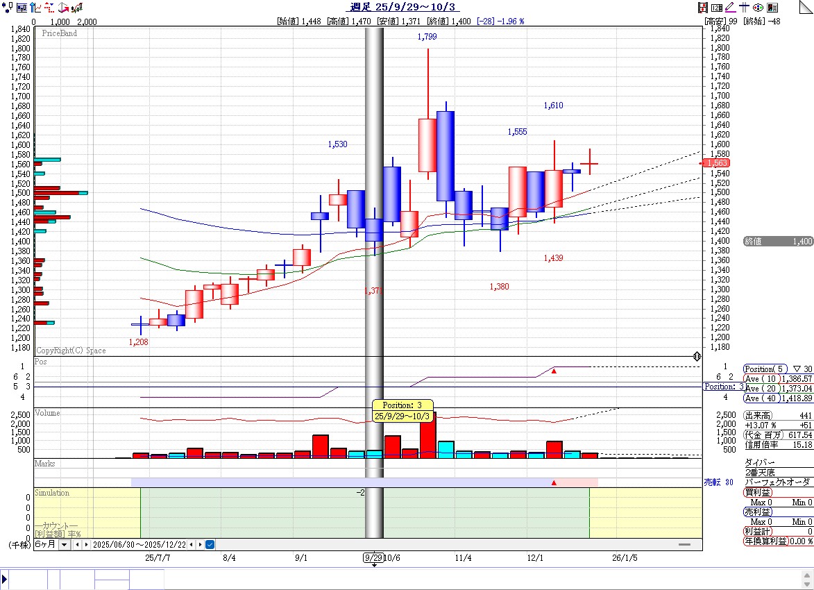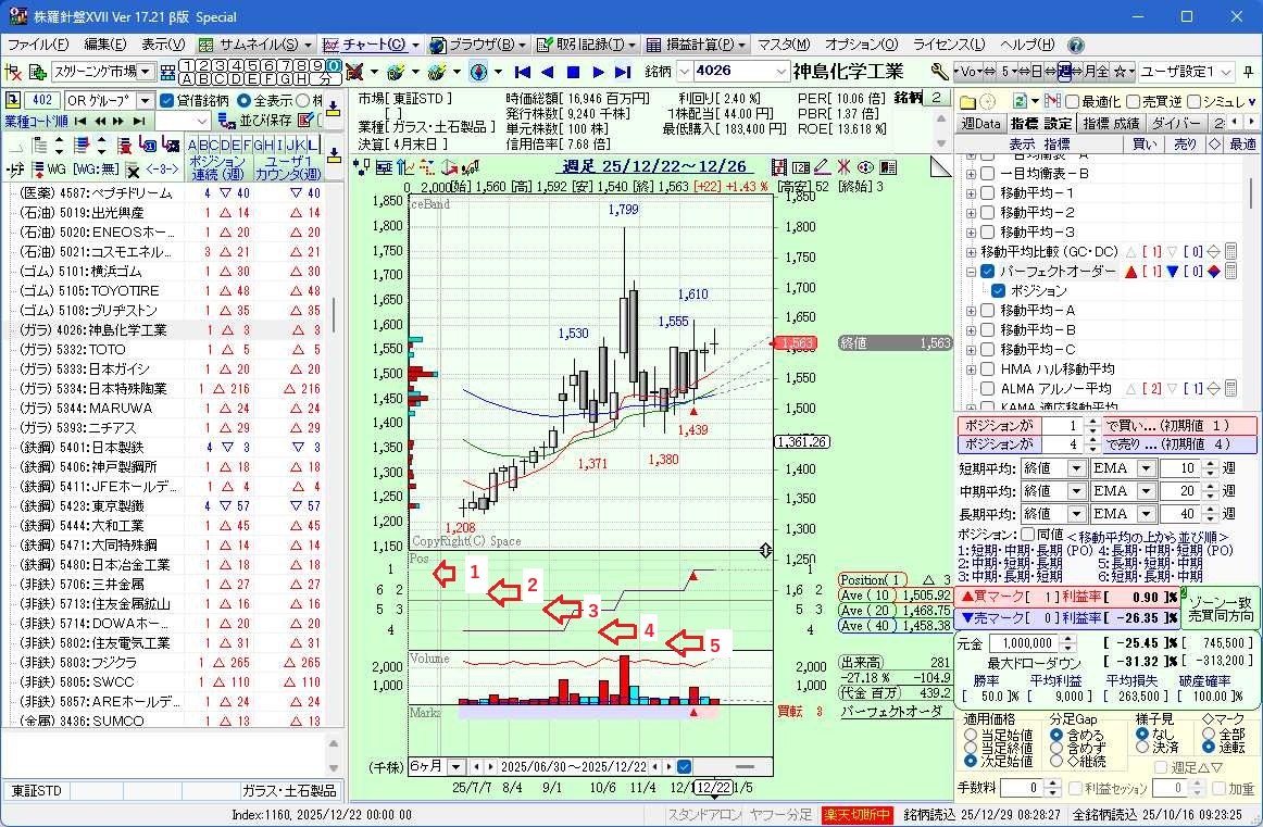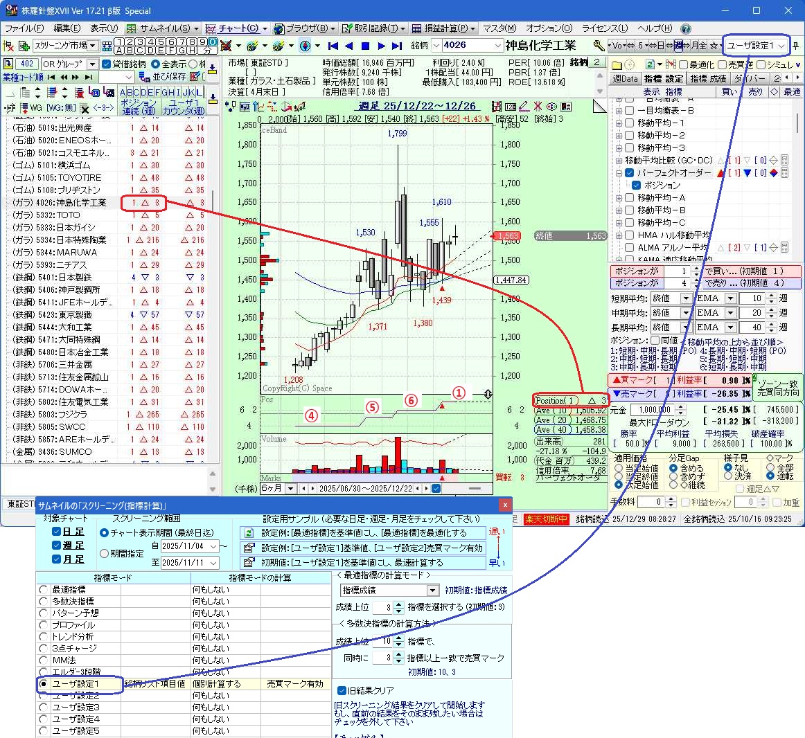 西さんの側で異常がなければ当方の操作ミスの疑いが濃厚と考え、再度スクリーニングをした結果、銘柄リスト側のポジション値が 1△3となり、西さんと同じ結果を得ました。(でも何故?)