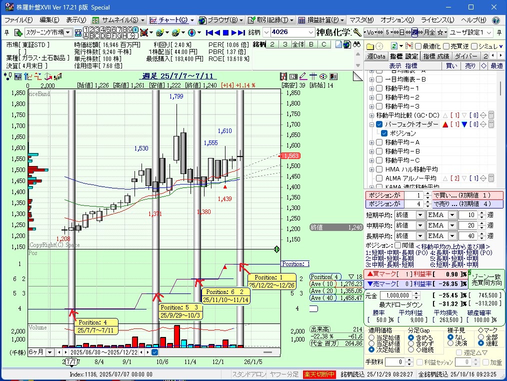 >結果を検証してみると、所々に変な結果が見られます。例えば(4026)神島化学の場合、左側から順に読んでいくと