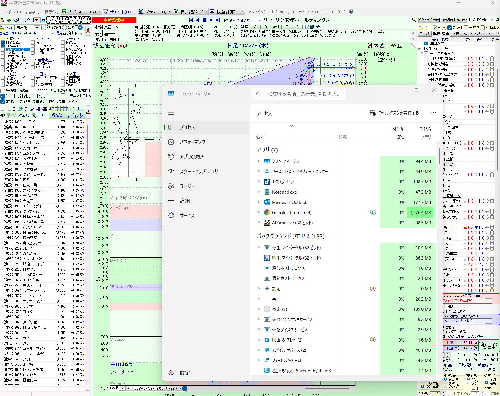 「作業中です「終了」出来ません」と表示され、株羅針盤自体も終了できません。