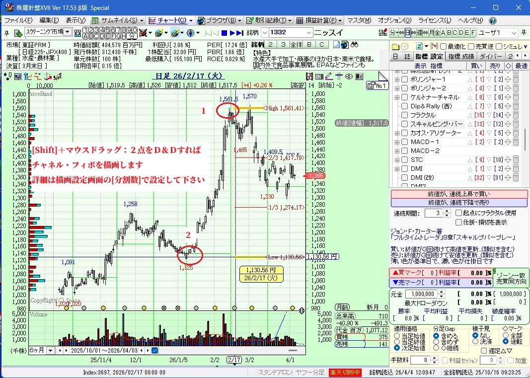 >[Shift]+マウスドラッグ:2点をD&Dすればチャネル・フィボを描画します