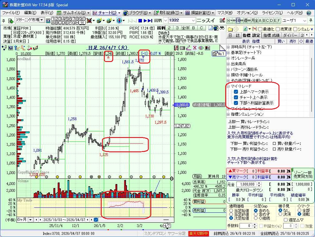 ⇒参考図1...▲:買いマーク、▼:売りマーク、チャート上へ売買ライン、下部へ利益計算